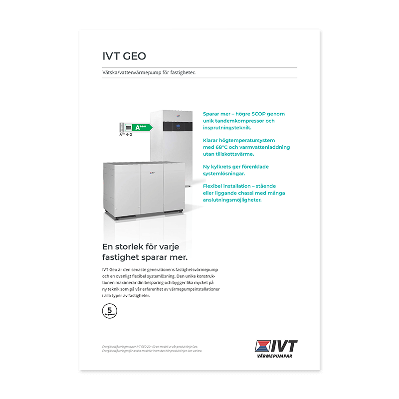 Ingen fastighet är den andra lik. Därför kommer vår värmepump IVT Geo i åtta olika effektstorlekar. Det gör att vi kan sätta ihop en systemlösning som passar de exakta behoven för varje fastighet. Och eftersom du betalar för precis det du behöver blir investeringskostnaden lägre, och besparingen högre.
